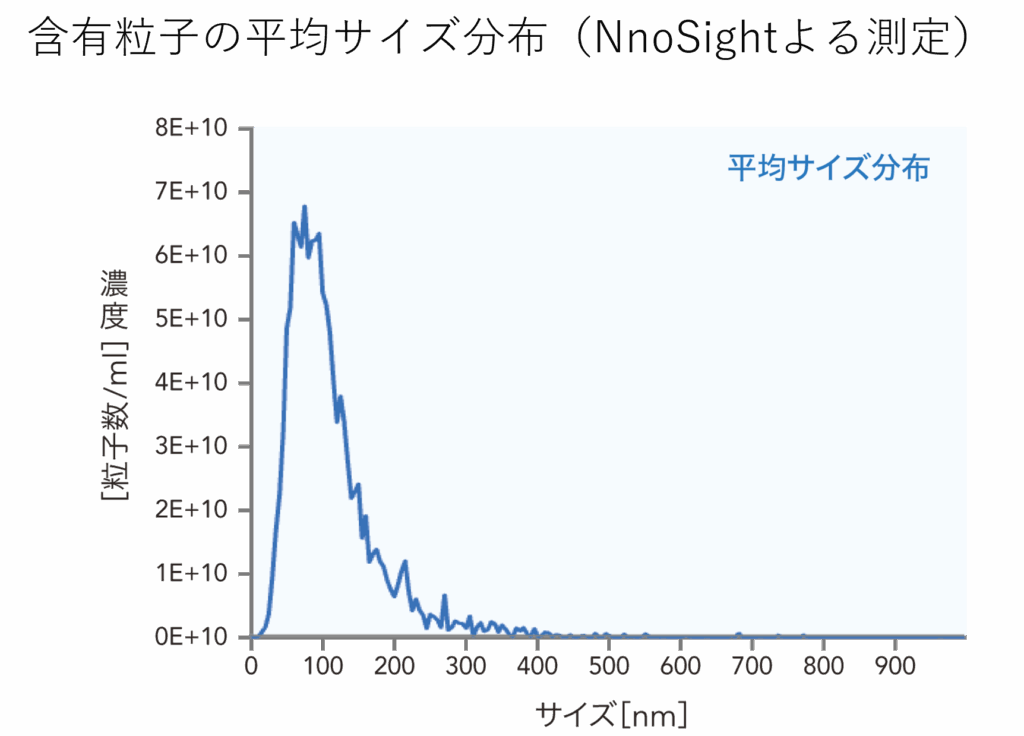 また、製品に含まれている物質の平均サイズを分析したところ、50-150nmの成分が数多く含まれていることが確認されました(下右図) 。