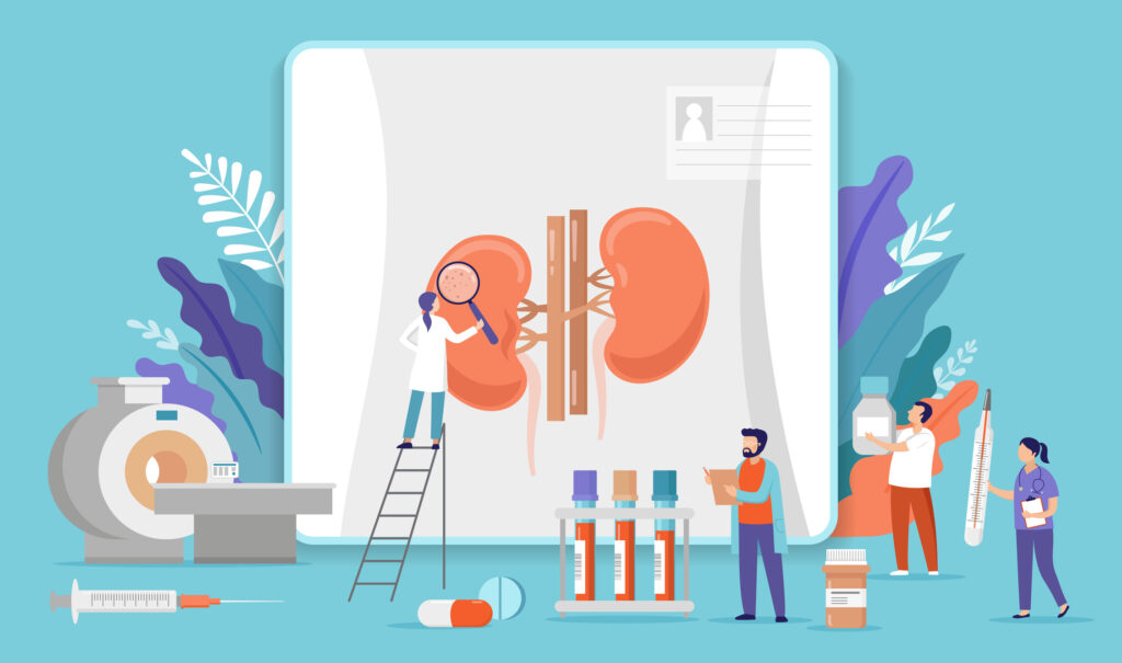 腎臓は、血液中の老廃物を除いて尿を生成し、塩分やミネラルのバランスや血圧を調節することで、私たちの体にとって非常に重要な役割を果たしています。さらに腎臓は、赤血球を作るためのホルモンや、骨を強くするために大切な活性化ビタミンDも作っています。腎臓はいったん機能が低下すると回復は困難であり、病気が進行すると透析治療や腎移植などが必要になることがあります。
