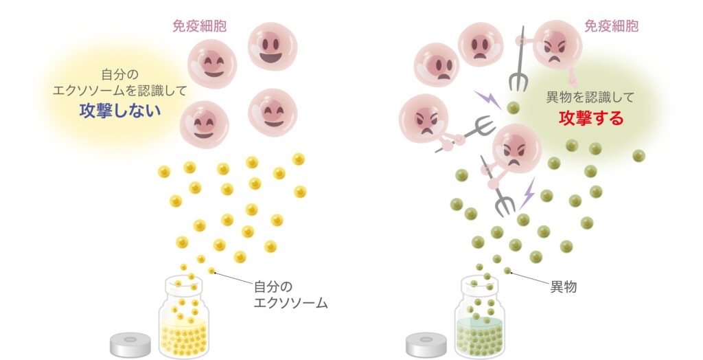 エクソソームは細胞ではありませんが、実は細胞と同じく、その表面に自身と他人を区別する標識が存在しているのです。自身のエクソソームは、免疫の攻撃を受けにくいと考えられます。