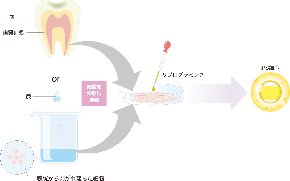 ご本人の尿または不要になった歯からiPS細胞を作製し、確実に保管いたします。