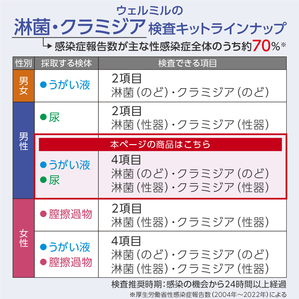 郵送検査「ウェルミル」では、感染しやすい主な性病である淋菌(淋病)&クラミジアの2種類をセットで検査できる検査キットを販売しております。