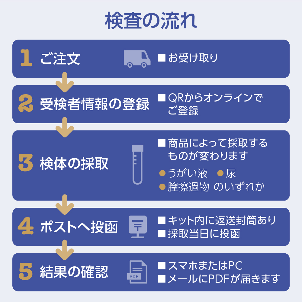 同封の採取手順書により、初めての方でも安心して正確な検体採取が可能です。ご自分で採取いただくため、手順書はよくお読みいただいた上でご利用ください。