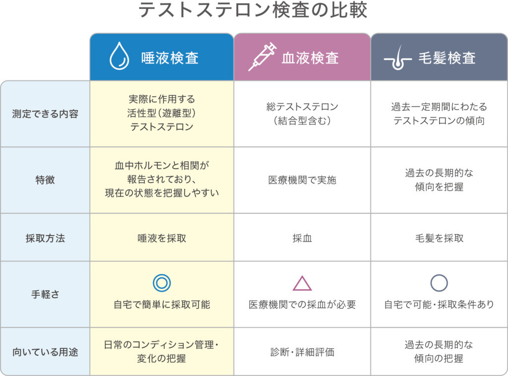• 唾液検査:体に実際に作用している活性型(遊離型)テストステロンを反映しやすく、日々の変化を把握しやすい方法
