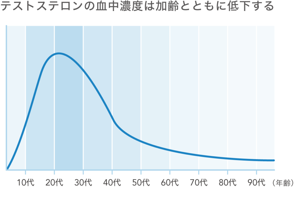 テストステロンの血中濃度は男性において一日の間で大きく変動し、朝に高くお昼前後から下がっていく傾向にあります。また、テストステロンは20代ごろにピークを迎え、年齢が上がるとともに下がっていきます。年齢がテストステロン低下の一番の要因ですが、それ以外にも環境の変化やストレス、食生活などの生活習慣もテストステロンの血中濃度に大きく関わっています。