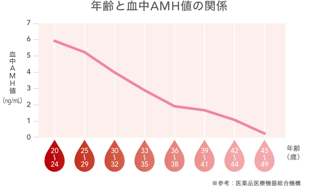 AMHは、卵巣に成長途中の卵子がどれだけあるか(卵巣予備機能または卵巣年齢)を相対的に確認する指標です。同年代の女性と比較して妊娠の可能性が高いか低いかを推定することができ、近年注目を集めています。さらに、AMHは、月経不順や不妊の原因となることがあるPCOS(多嚢胞性卵巣症候群)のリスク評価にも使われています。