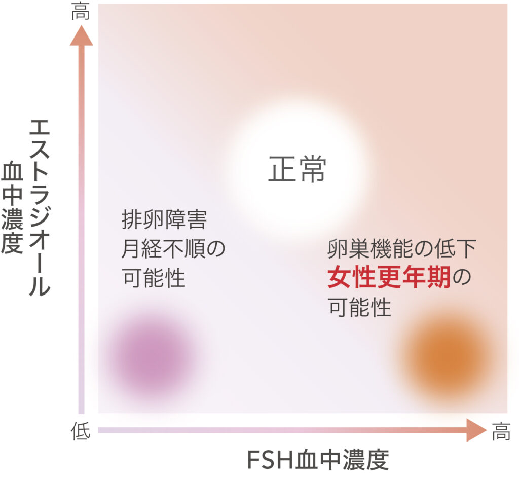 FSHが高く、エストラジオールが低い場合、卵巣機能の低下を示し、閉経が近づいている可能性があります。つまり、更年期症状が現れることがあるという状態です。