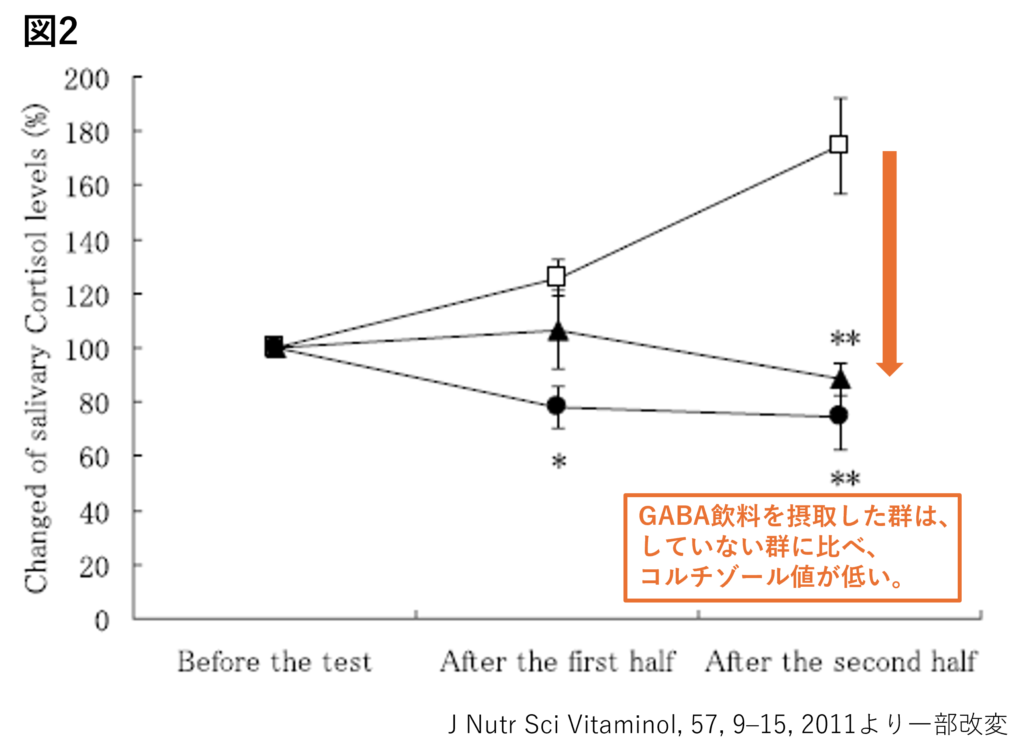 その結果、GABA飲料を摂取した群は、接種していない群に比べ、コルチゾール値が低いことが分かりました。