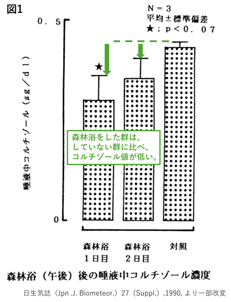 その結果、森林浴を行った群(森林浴1日目、2日目)は、行っていない群(対照)に比べ、コルチゾール値が低いことが分かりました。