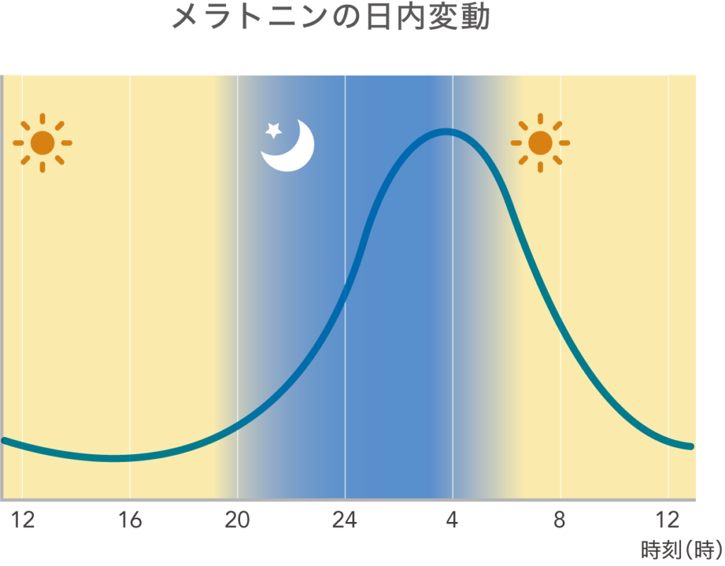 メラトニンは日中にはほとんど分泌されず、夜間にピークに達する「日内リズム」に影響されるホルモンです。したがって、体の睡眠と覚醒リズムに深く関わり、体内時計や概日リズム(サーカディアンリズム)をコントロールする役割を果たします。