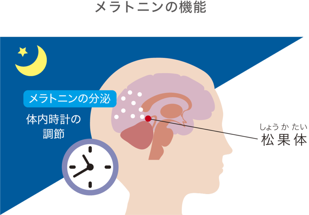 体内時計(概日リズム)を調整する重要な役割を担います。特に、夜間に分泌が増加し、眠気を誘発することで睡眠をサポートします。